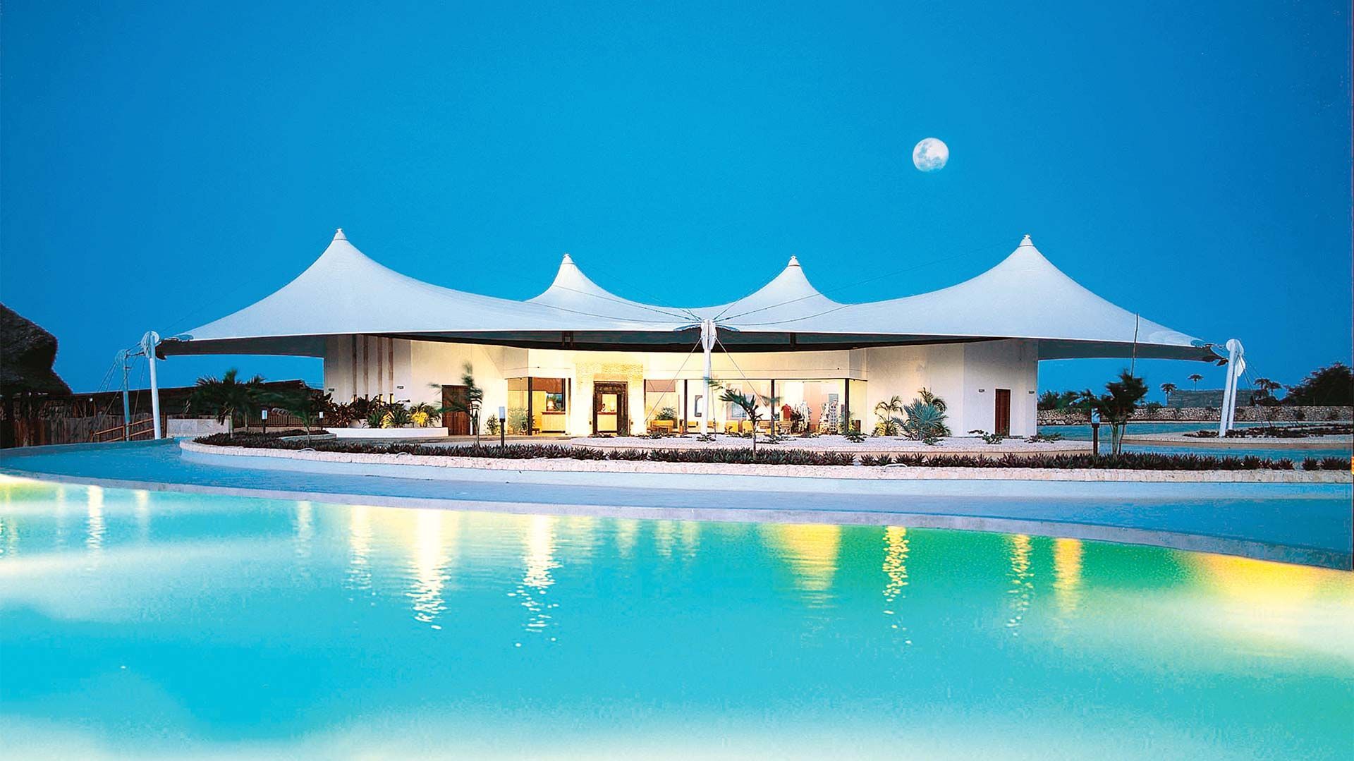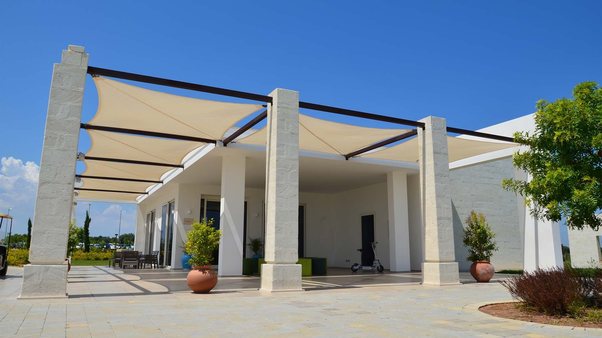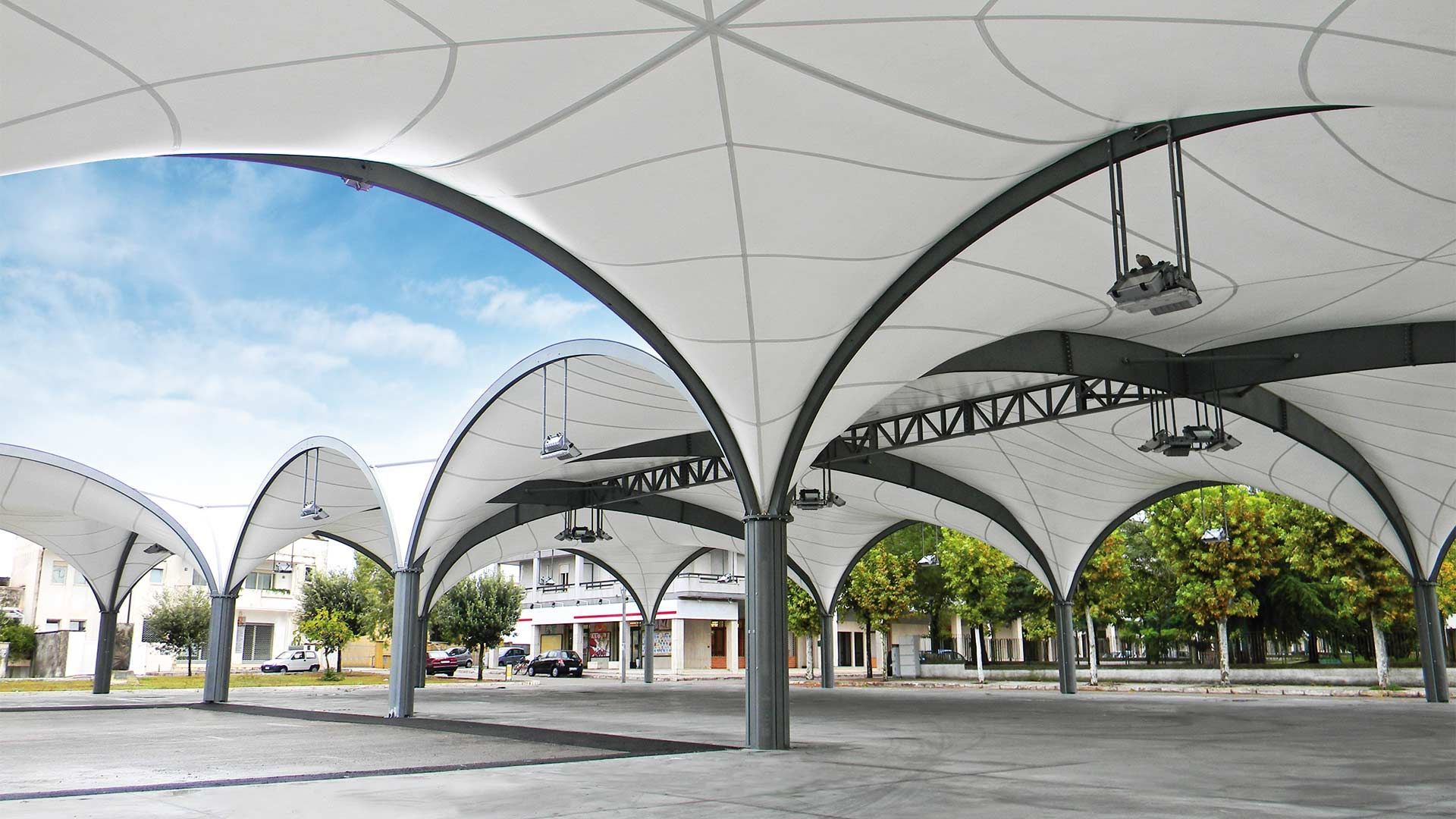 Innovativo sistema di copertura fissa composto da due teli in membrana tessile con all’interno un meccanismo di tensionamento non visibile, senza traverse inclinate.