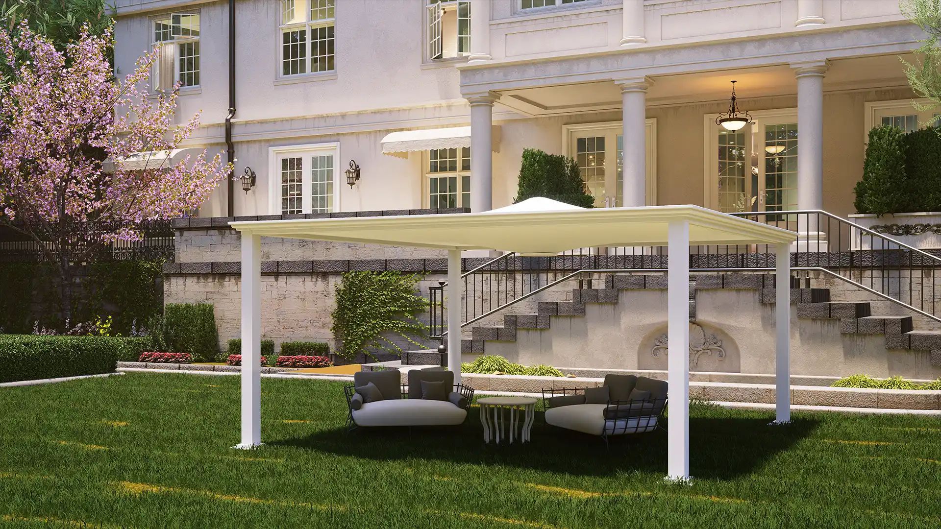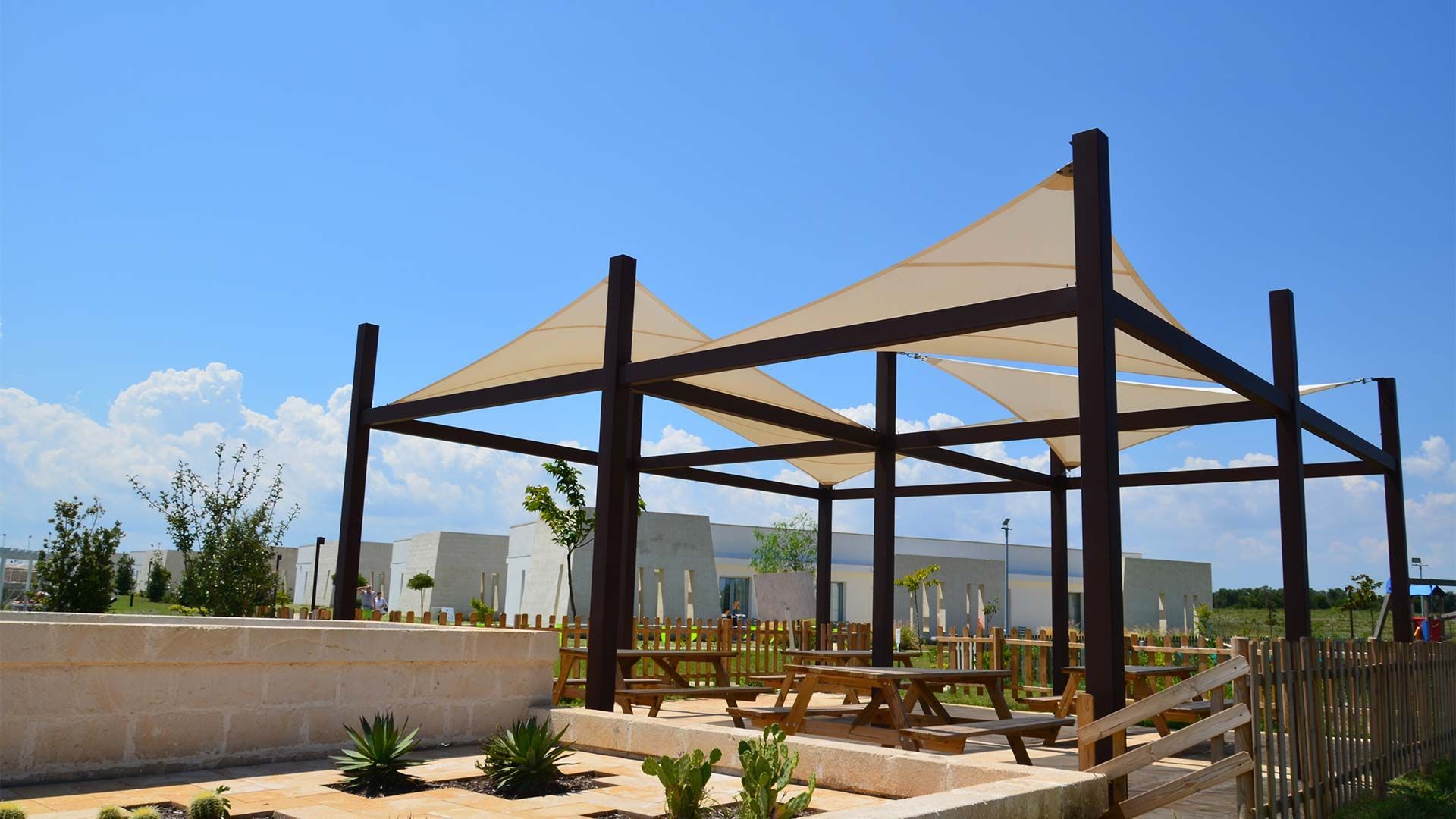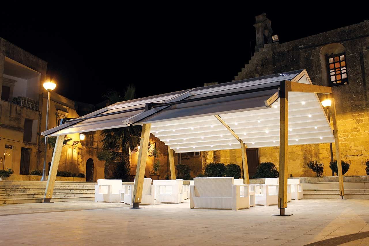 Struttura dall’eleganza moderna che si contraddistingue per la sua linearità estetica. La copertura in membrana tessile fissa garantisce il riparo dalla pioggia, dal sole e dal vento.