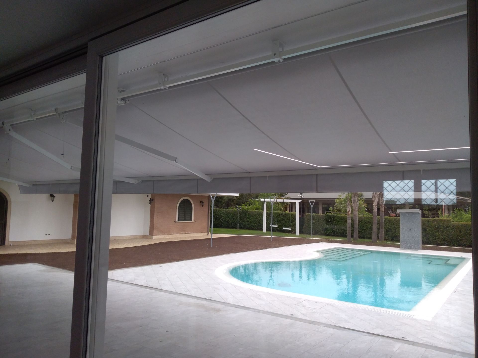 Sistema di lame con chiusura ad impacchettamento. Integra perfettamente nel suo perimetro interno ed esterno le strip led per permettere l’uso della pergola in qualsiasi ora del giorno.
